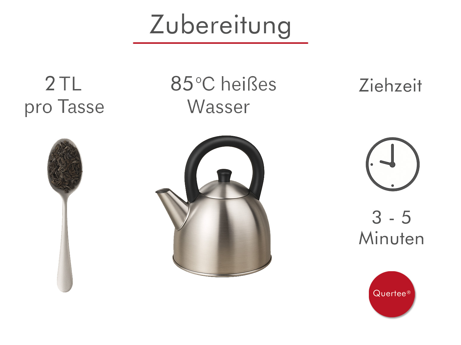Zubereitung: Nehmen Sie 2 TL Tee für eine Tasse (ca. 200 ml). Mit 85°C heißem Wasser aufgießen und 3 - 5 Minuten ziehen lassen.