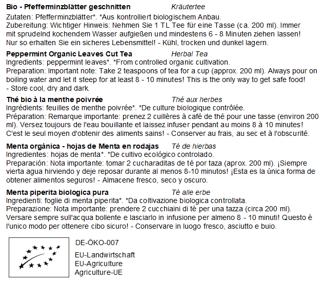 - Zutaten: 100 % geschnittene Pfefferminzblätter aus biologischem Anbau