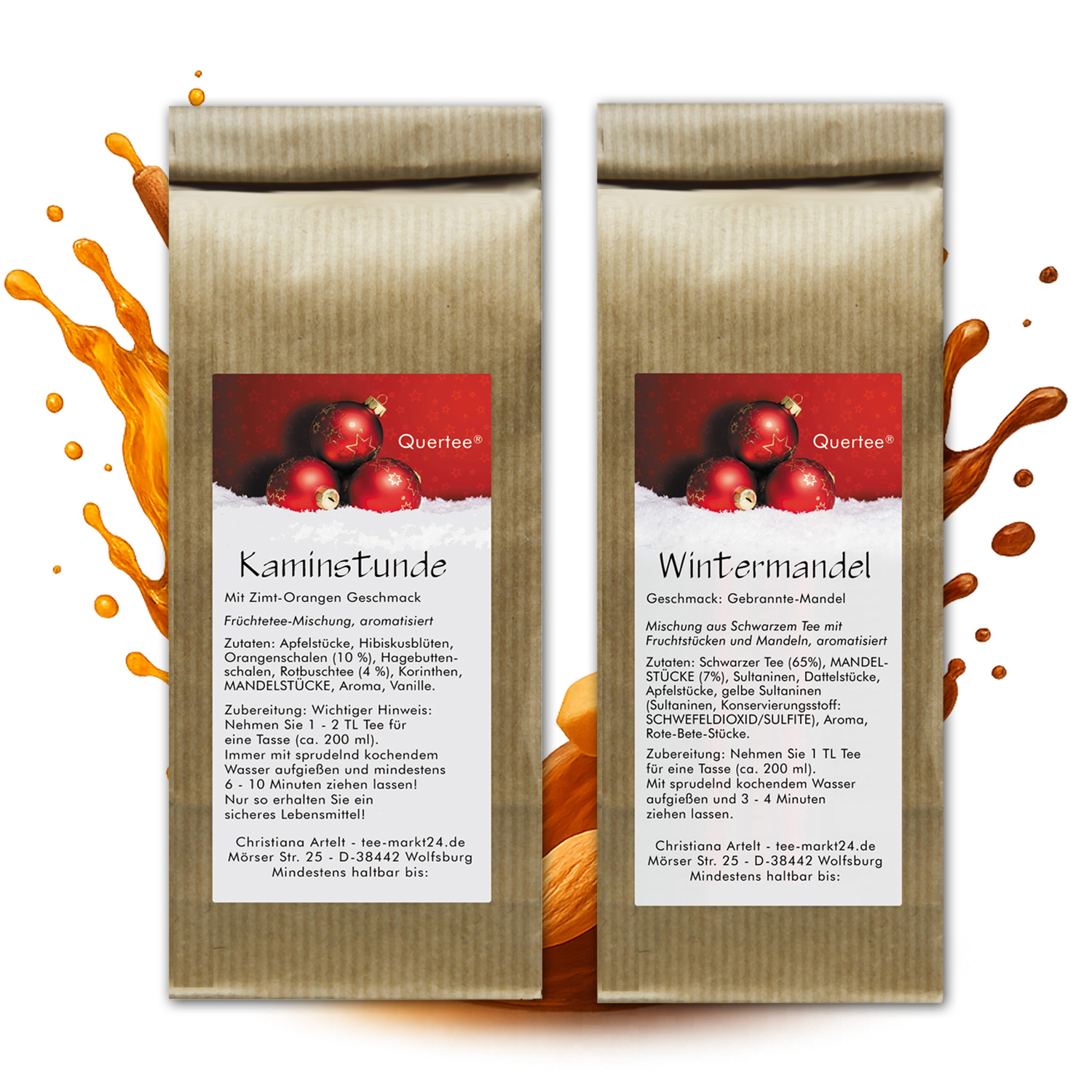 100 g Früchtetee "Kaminstunde" und 100 g Schwarztee "Wintermandel" (200 g Tee insgesamt)