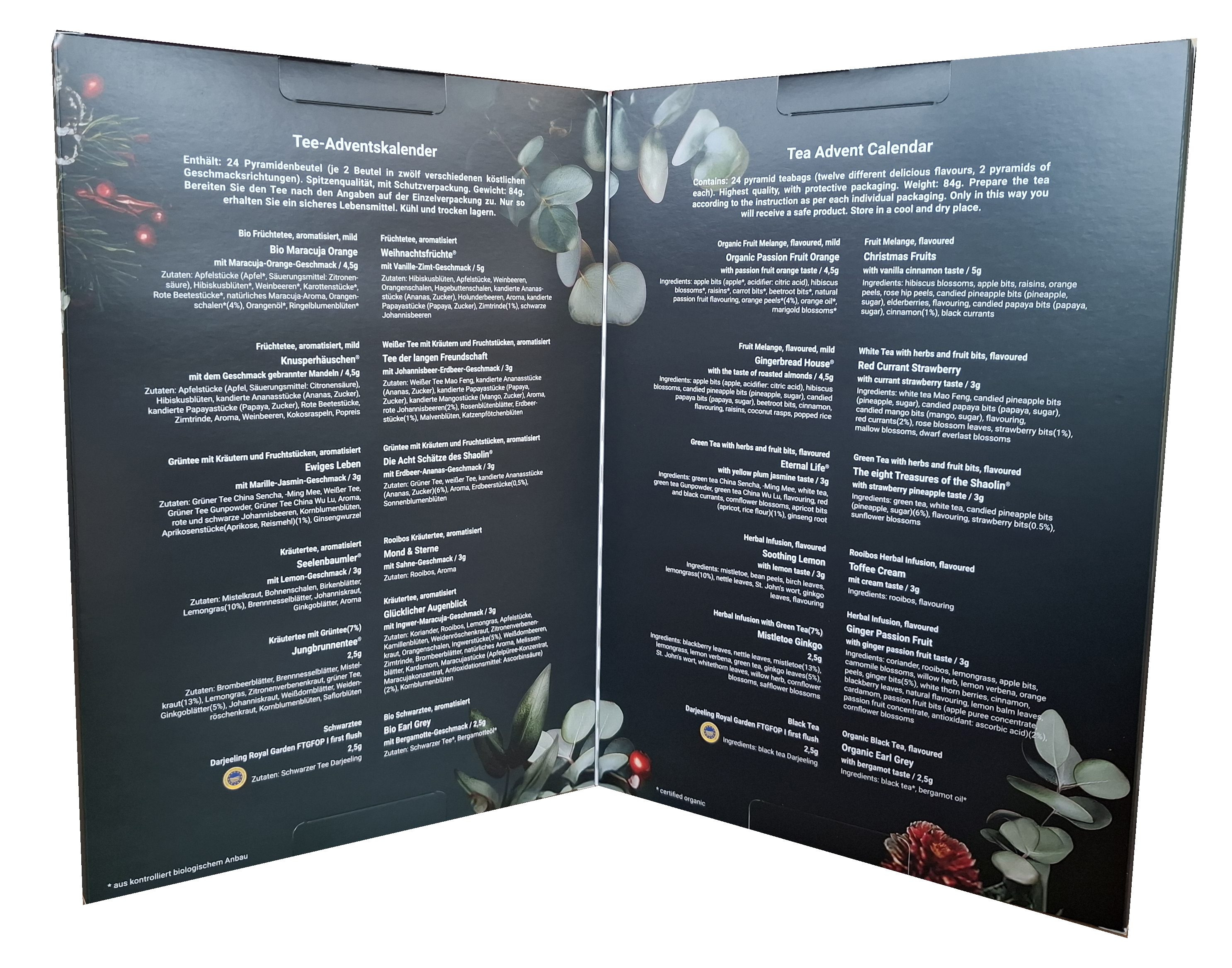 Eigenschaften "Tee Adventskalender als Booklet zum Aufklappen mit 24 x Premium Pyramiden Teebeutel von Floragold"