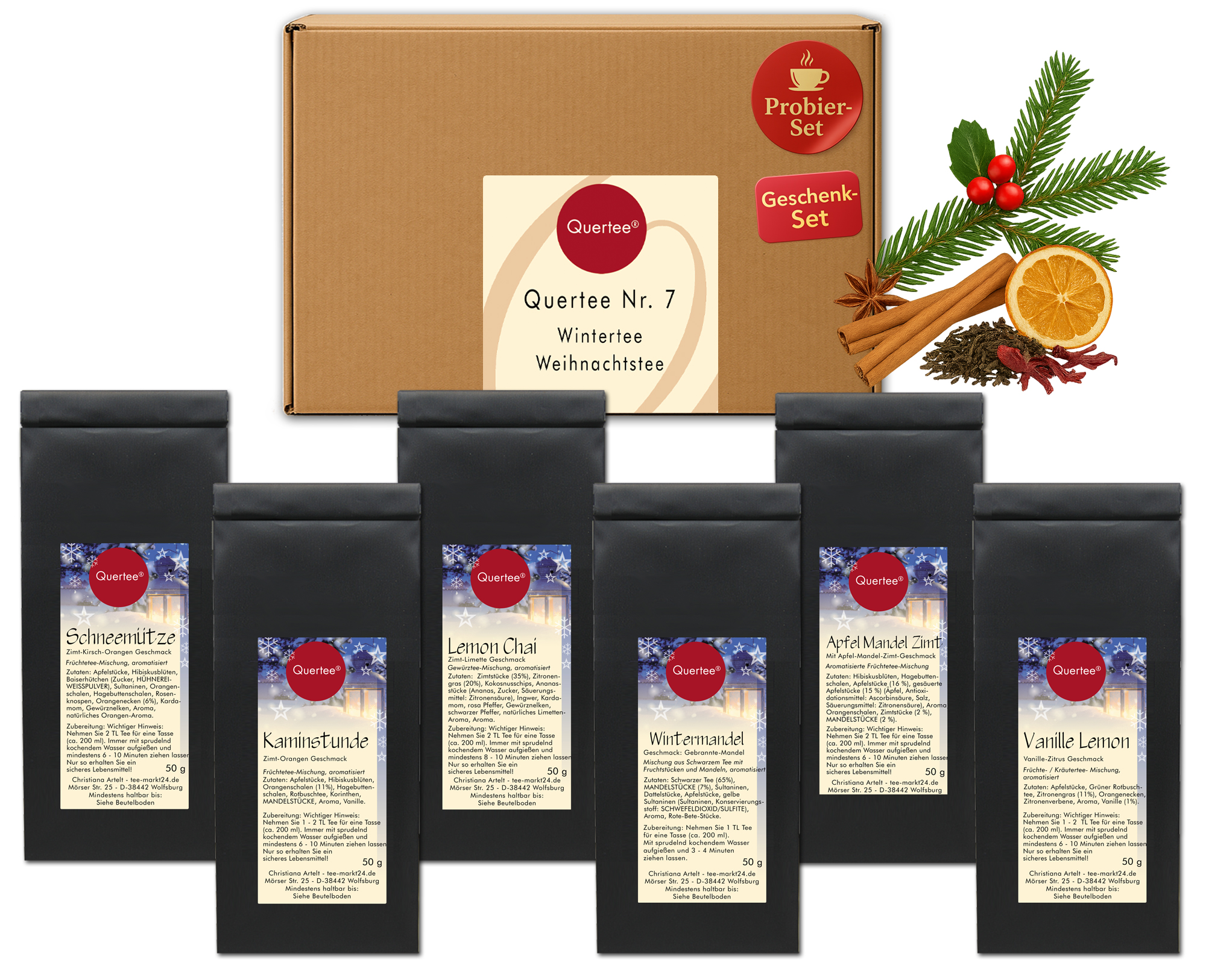 Produktinformationen ""Tee Geschenk Weihnachten Quertee Nr. 7 - 6 x 50 g Tee Geschenkset - Wintertee - Vanille Lemon, Schneemütze, Lemon Chai, Kaminstunde, Wintermandel, Winters Delight"