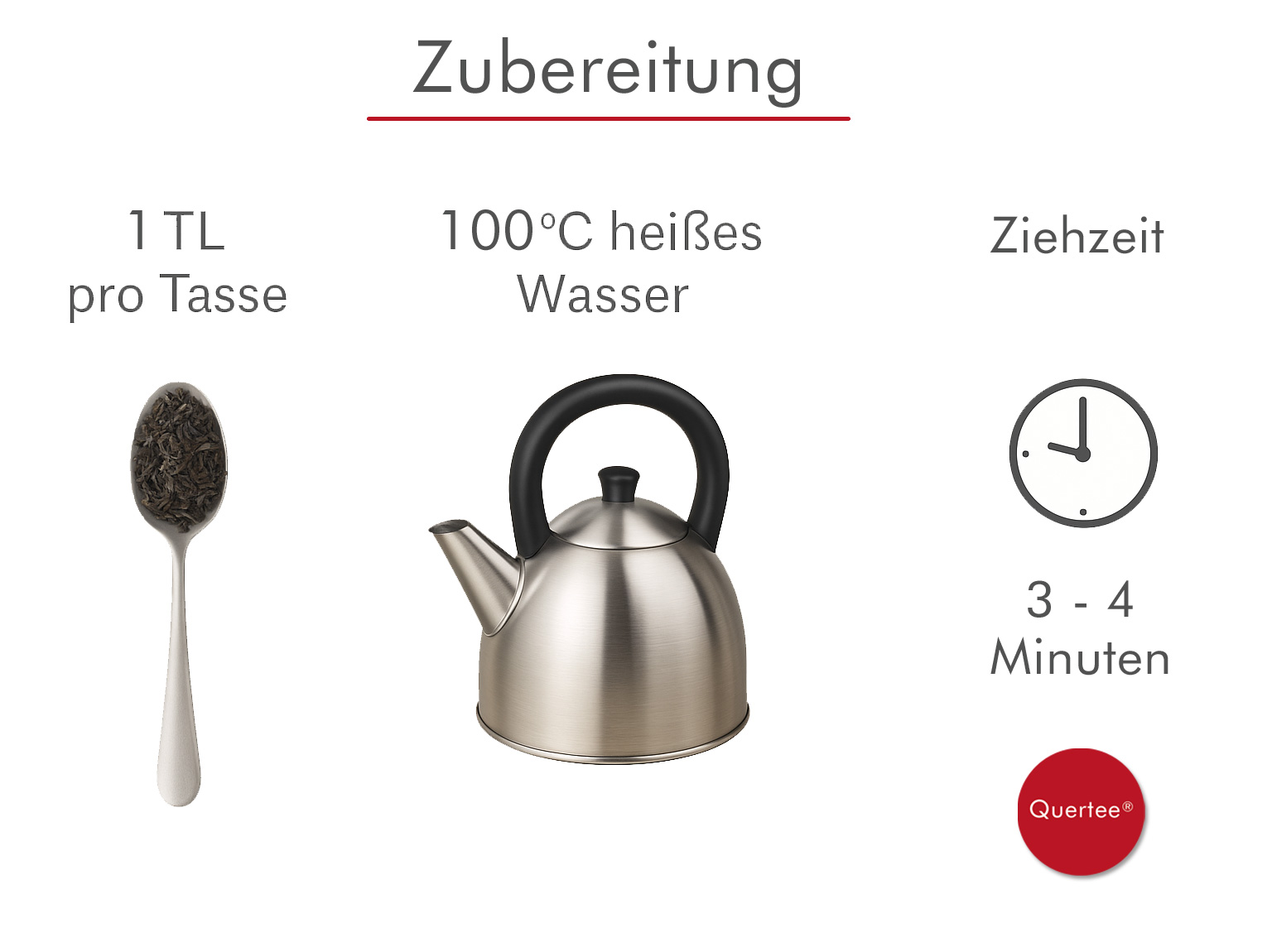 Zubereitung: 1 TL Tee für eine Tasse (ca. 200 ml), mit sprudelnd kochendem Wasser aufgießen und 3–4 Minuten ziehen lassen.