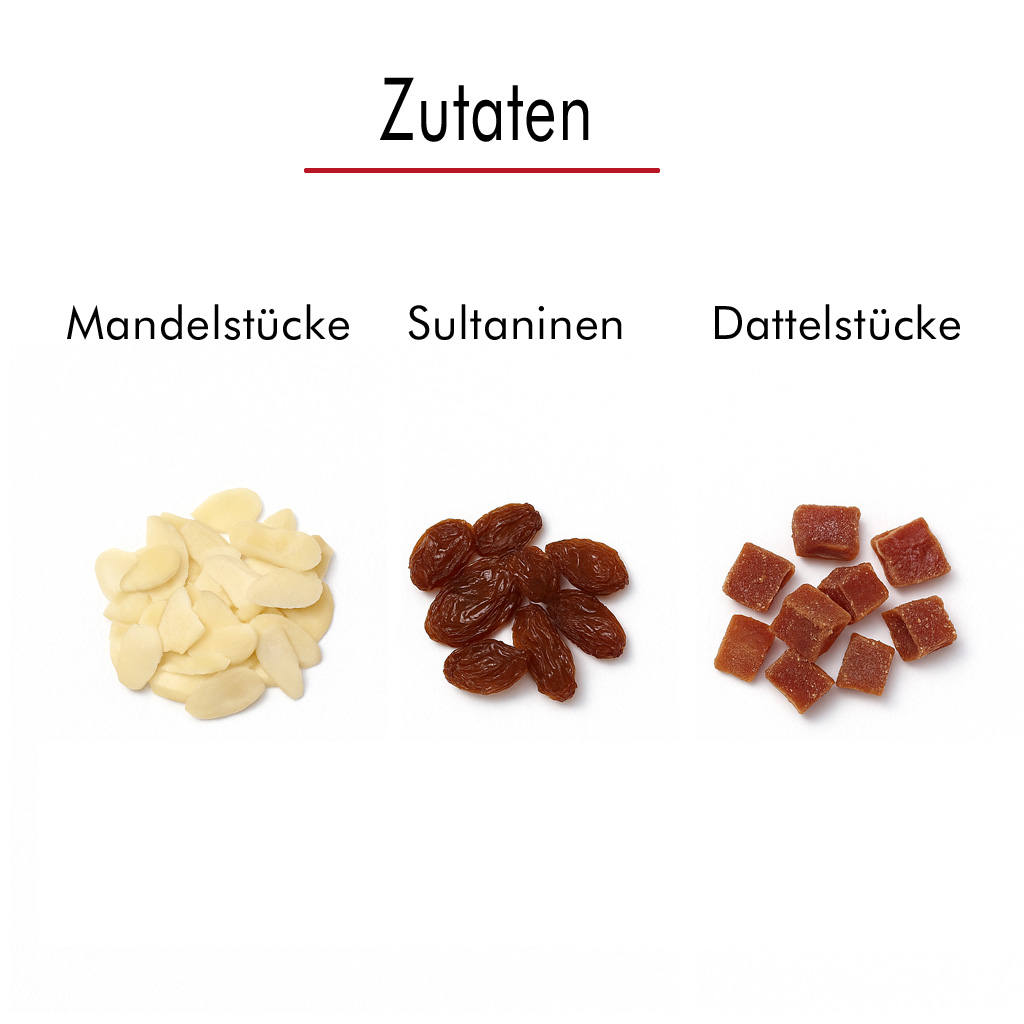 - Fruchtstücke & Mandeln integriert – mit 7 % Mandelstücken, Sultaninen, Dattelstücken, Apfelstücken und gelben Sultaninen für eine fruchtig-nussige Kombination.