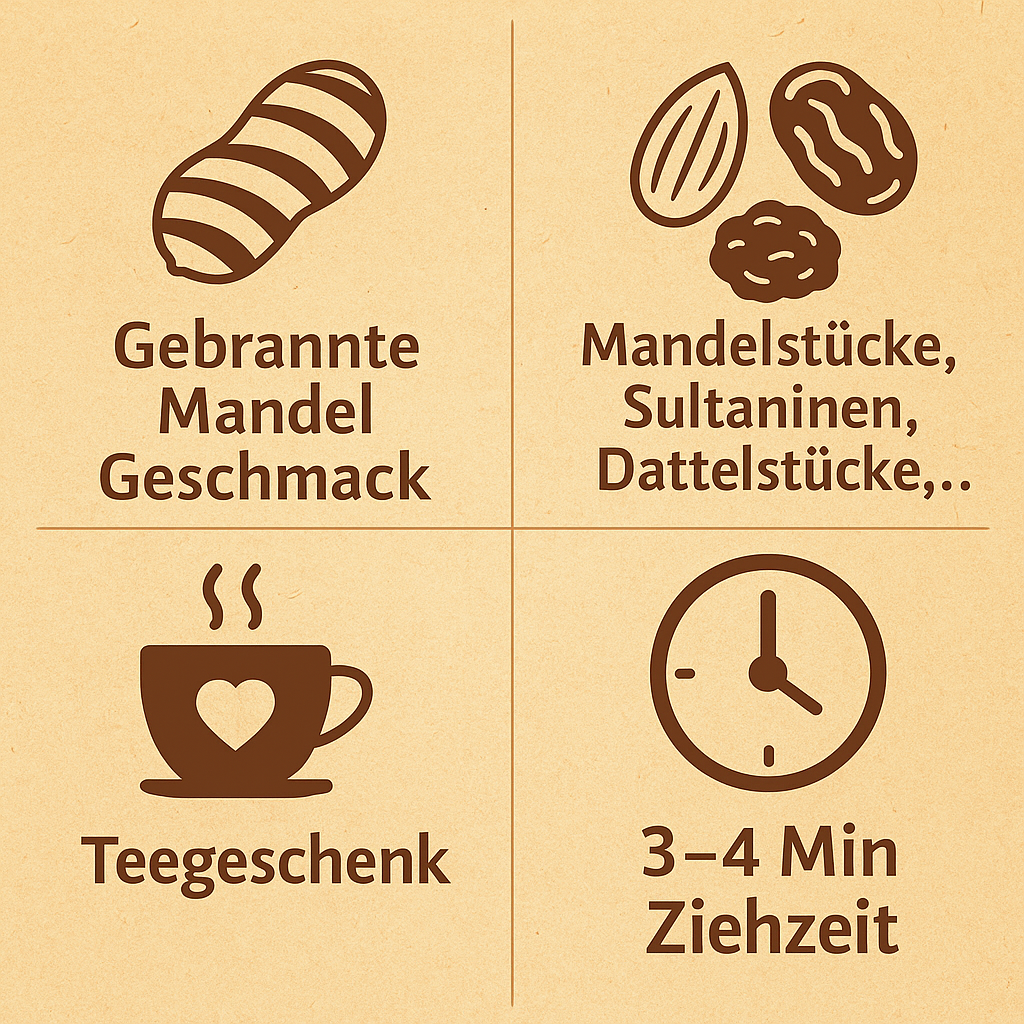 Mit feinstem Schwarzen Tee und einer liebevoll ausgewählten Komposition aus Mandelstücken, Sultaninen, Dattel- und Apfelstücken ist dieser Tee die perfekte Wahl, um die kalten Wintertage zu versüßen.