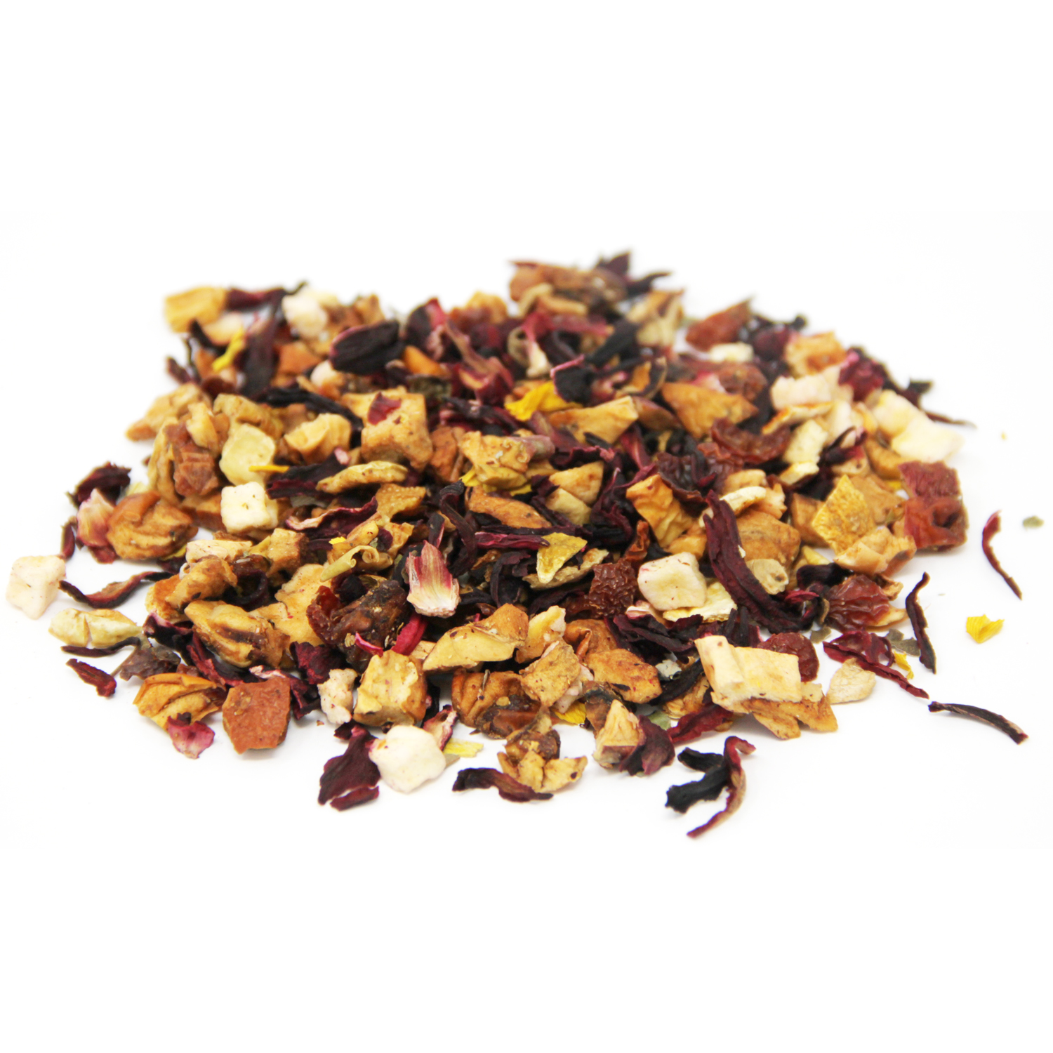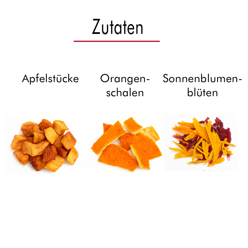 Zutaten: Apfelstücke, Hibiskusblüten, Hagebuttenschalen, Orangenschalen, natürliches Aroma, Sonnenblumenblüten, Brombeerblätter, Salz, Säuerungsmittel: Zitronensäure, Äpfel, Antioxidationsmittel: Ascorbinsäure.